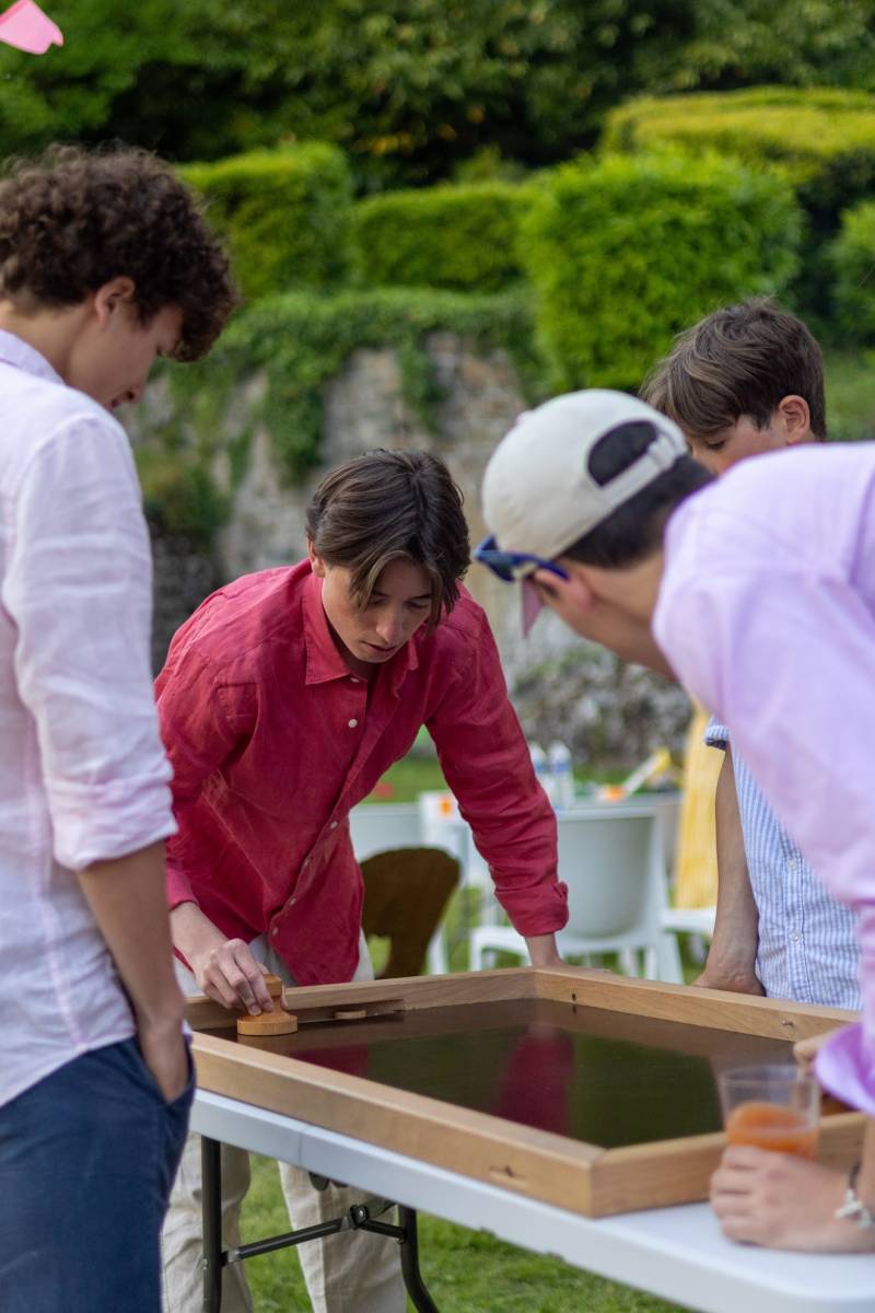 Plusieurs jeux en bois de grande taille ont été installés sur l'espace de réception, permettant aux invités de jouer librement tout au long de l'événement. Jeux d'adresse, de précision et de stratégie légère se sont naturellement intégrés au déroulement de la journée, offrant des temps de jeu spontanés et fédérateurs.