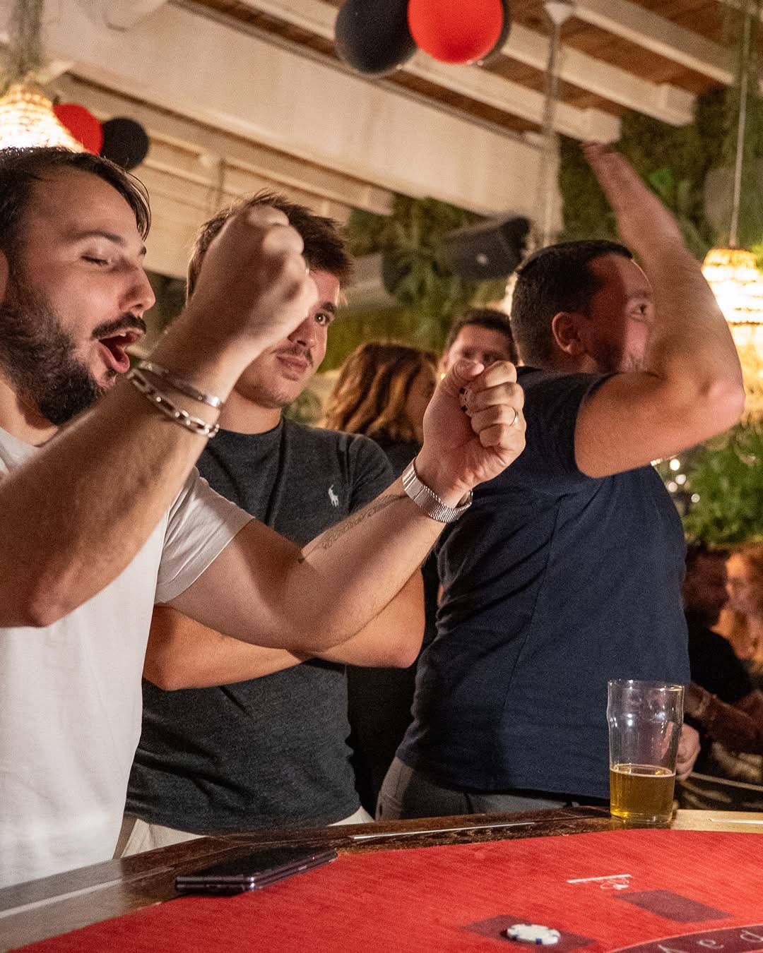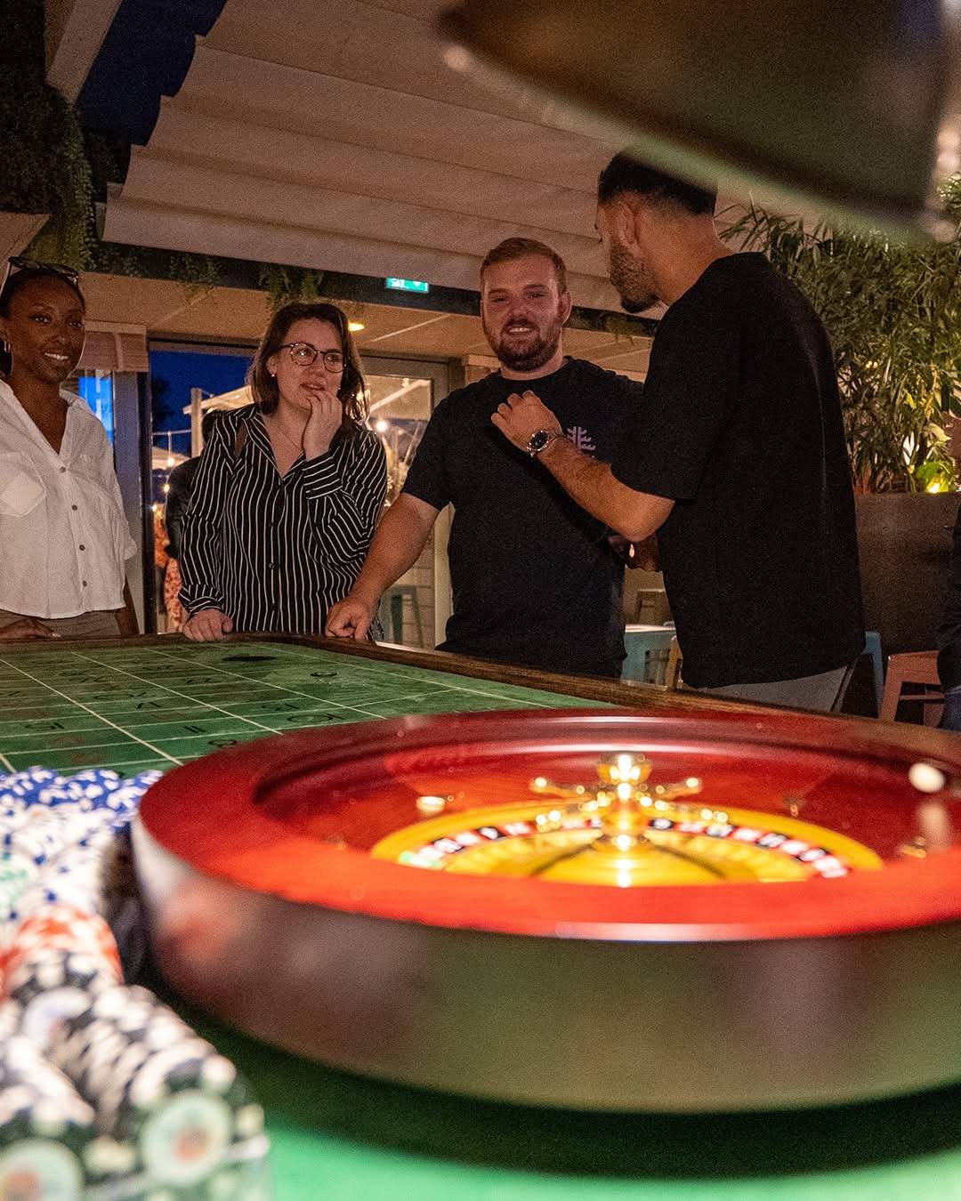 Nous avons également pris en charge l'installation et la mise en valeur du jeu de roulette spécialement revisité pour l'occasion. Les éléments scéniques, les jetons, l'espace de jeu et l'habillage visuel permettaient d'accueillir les participants dans des conditions professionnelles, tout en garantissant une circulation fluide dans le bar.